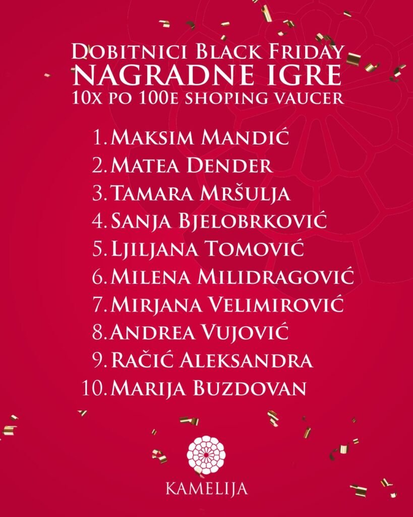 Dobitnici nagradne igre i 10 x po 100€ shoping vaučer Maksim Mandić Matea Dender Tamara Mršulja Sanja Bjelobrković Ljiljana Tomović Milena Milidragović Mirjana Velimirović Andrea Vujović Račić Aleksandra Marija Buzdovan