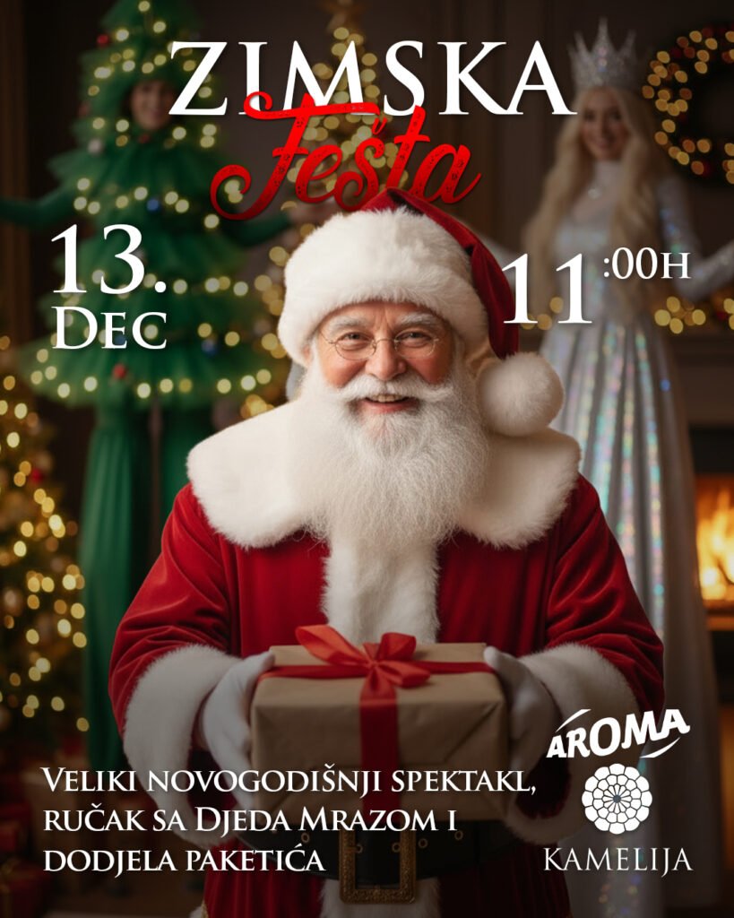 Najmagičniji dan u Kameliji od 11:00h donosi Veliki novogodišnji spektakl: Djeda Mraz u levitaciji, Ledenu kraljicu na štulama, mnooogo dječije radosti i na desetine svjetlucavih paketića koji čekaju svoje male vlasnike.Praznici počinju tamo gdje čarolija zaista postoji.Ne propustite najraskošniji događaj decembra.